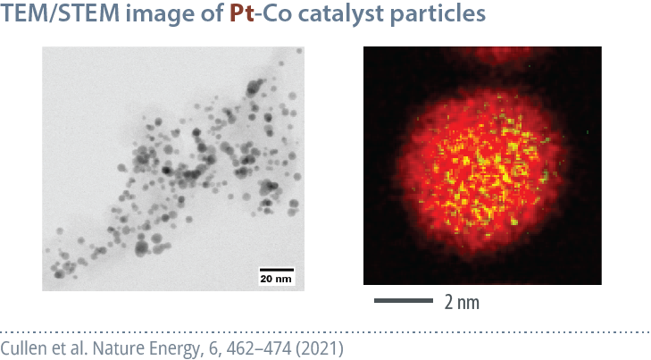 STEM-EDS map of individual Pt-Co nanoparticle image shows the Co alloy core covered with Pt-rich shell (in red)