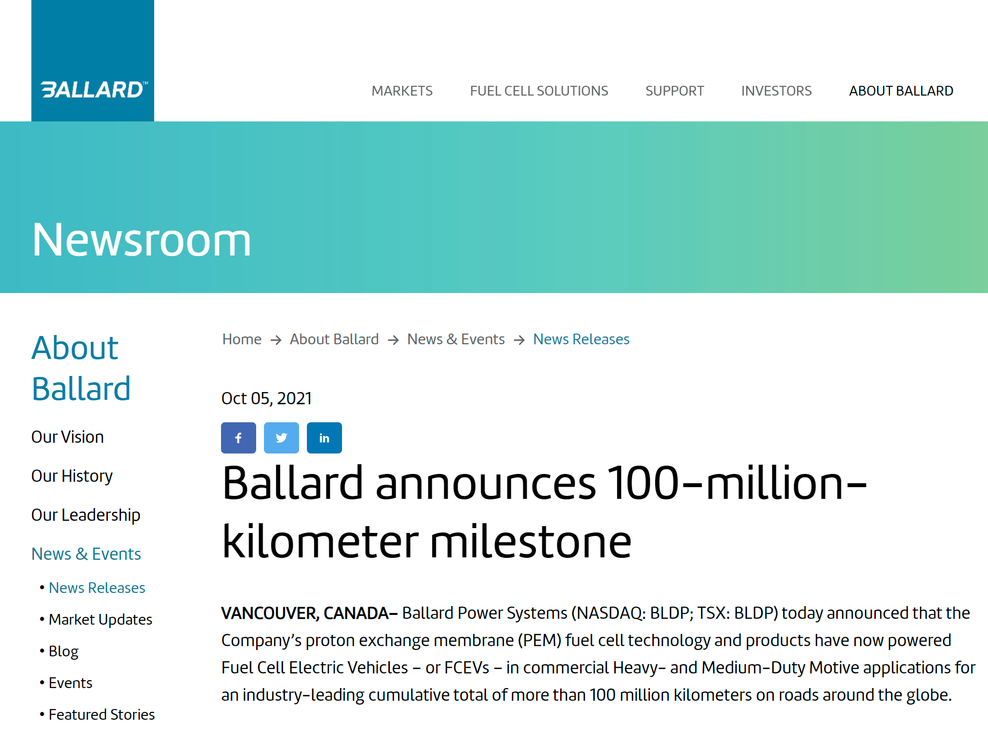 Ballard Power Systems announced that the Company’s proton exchange membrane (PEM) fuel cell technology and products have now powered Fuel Cell Electric Vehicles – or FCEVs – in commercial Heavy- and Medium-Duty Motive applications for an industry-leading cumulative total of more than 100 million kilometers on roads around the globe
