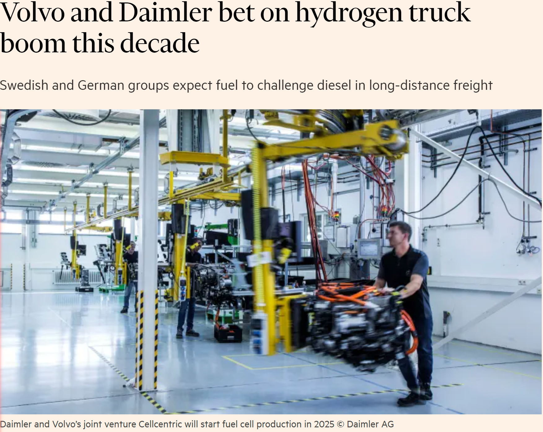 FT: Volvo and Daimler bet on Hydrogen Truck Boom this decade