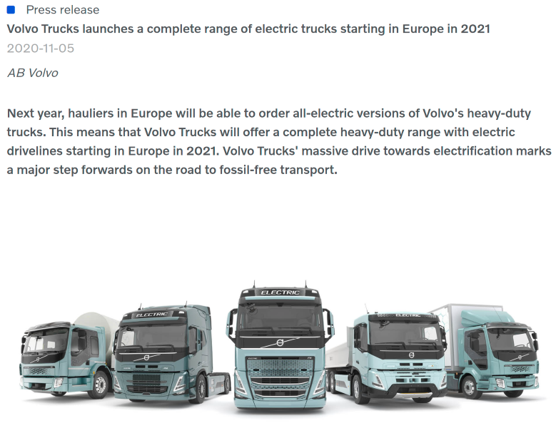 Volvo Trucks launches a range of electric trucks starting in Europe in 2021