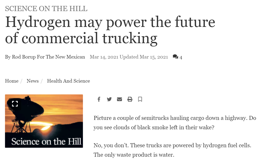 Rod Borup, the co-director of the Million Mile Fuel Cell Truck and Los Alamos National Laboratory’s program manager for fuel cells and vehicle technology, contributed to an article on the New Mexican's Science on the Hill section. The article discusses the current state and the future of fuel-cell-powered clean trucks, their positive impact on the environment, and their advantages over diesel trucks.